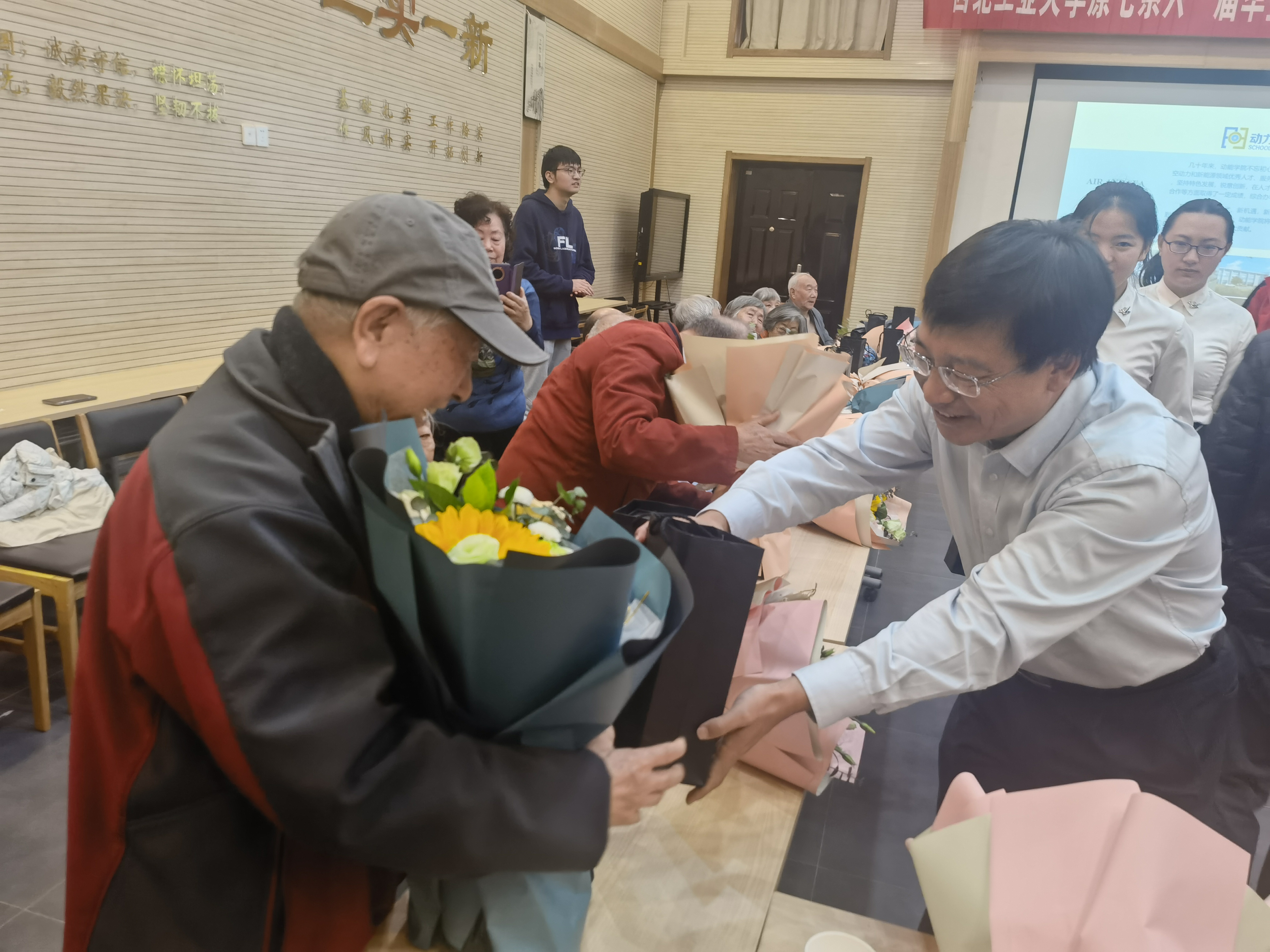 随后,凌云班学生代表也为校友们佩戴了校徽并献上鲜花。王占学院长也向校友们发放学院的纪念品。