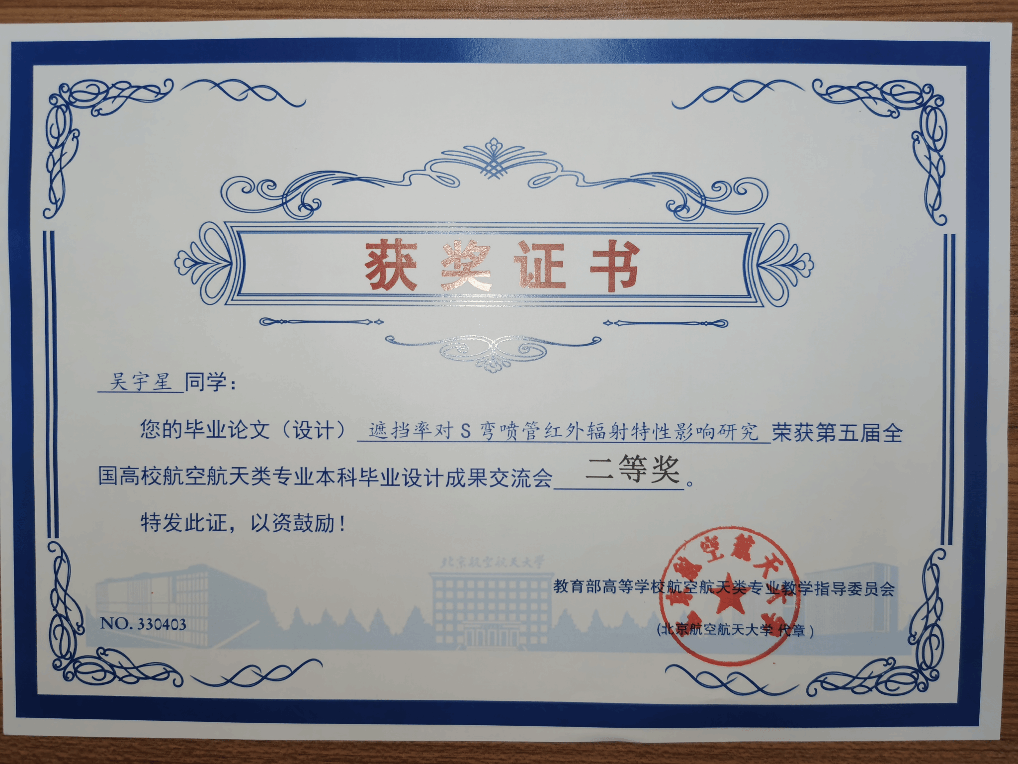 吴宇星获奖证书