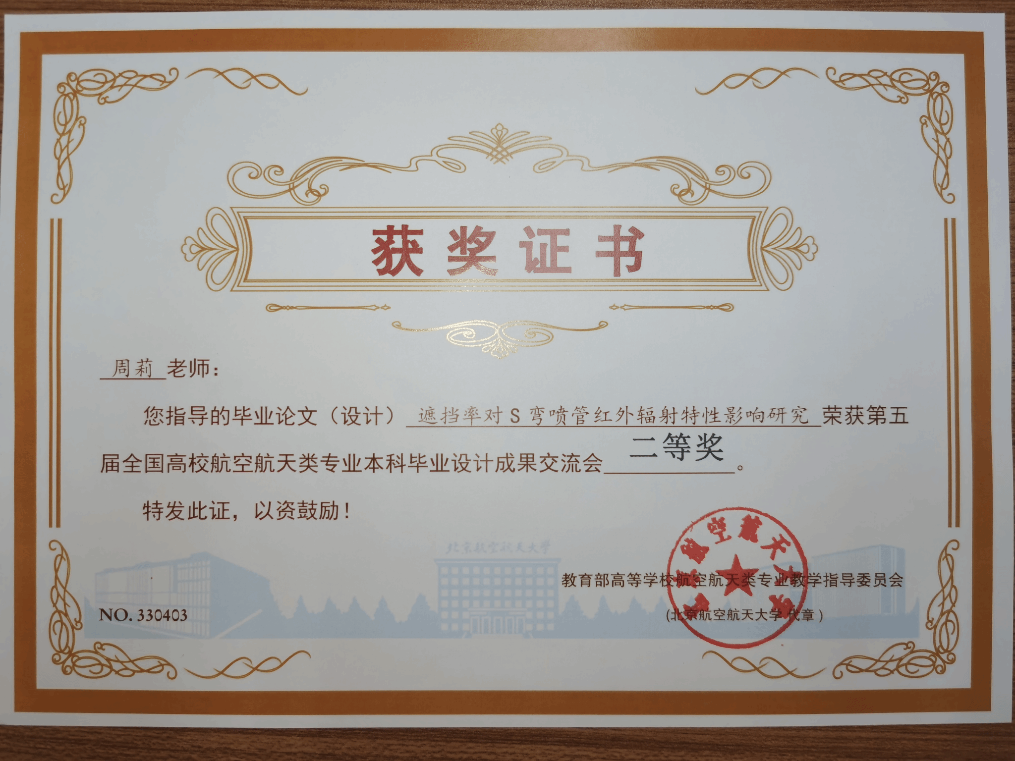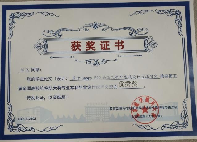 陈飞获奖证书