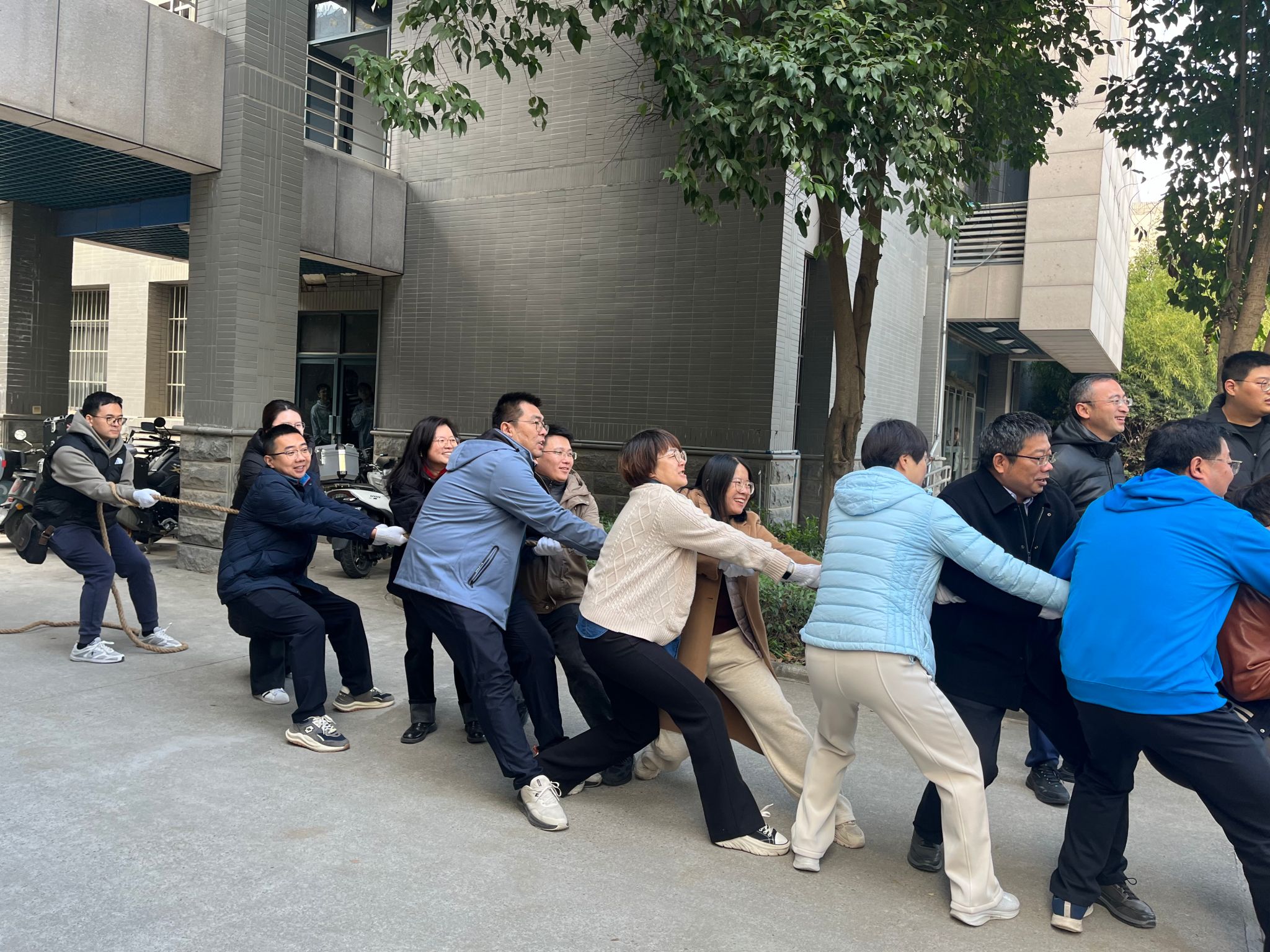 12月6日,由威廉williamhill体育工会组织的教职工拔河比赛在学院院楼举行。此次活动旨在增强教职工体质,发扬体育精神,进一步增强学院的集体荣誉感。全院教职工积极响应,共组织五支队伍、八十余名队员参加比赛,现场气氛热烈,欢呼声此起彼伏。
