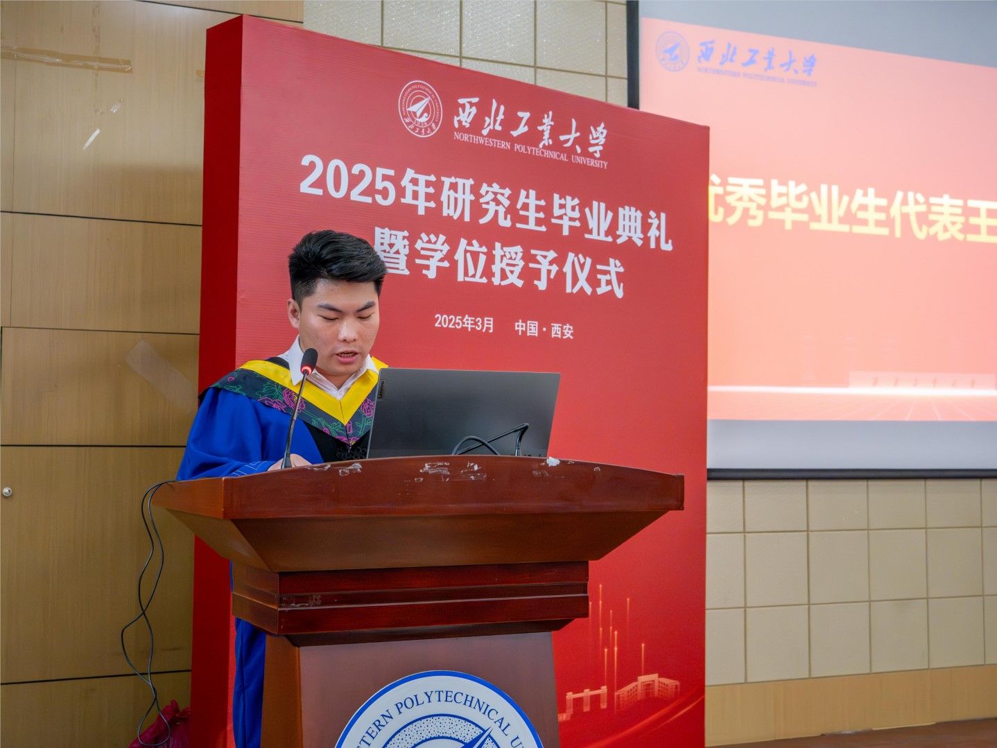 优秀毕业生代表王志伟发言。他代表全体毕业生向精心培养大家的母校、老师和家人致以最衷心的感谢。他用“探索、坚守与传承”回忆自己的求学时光,以“立大志、明大德、成大才”与毕业生们共勉。愿毕业生们铭记西工大人的责任与使命,带着西工大人独有的烙印,以公诚勇毅之心,铸就蓝天报国魂!