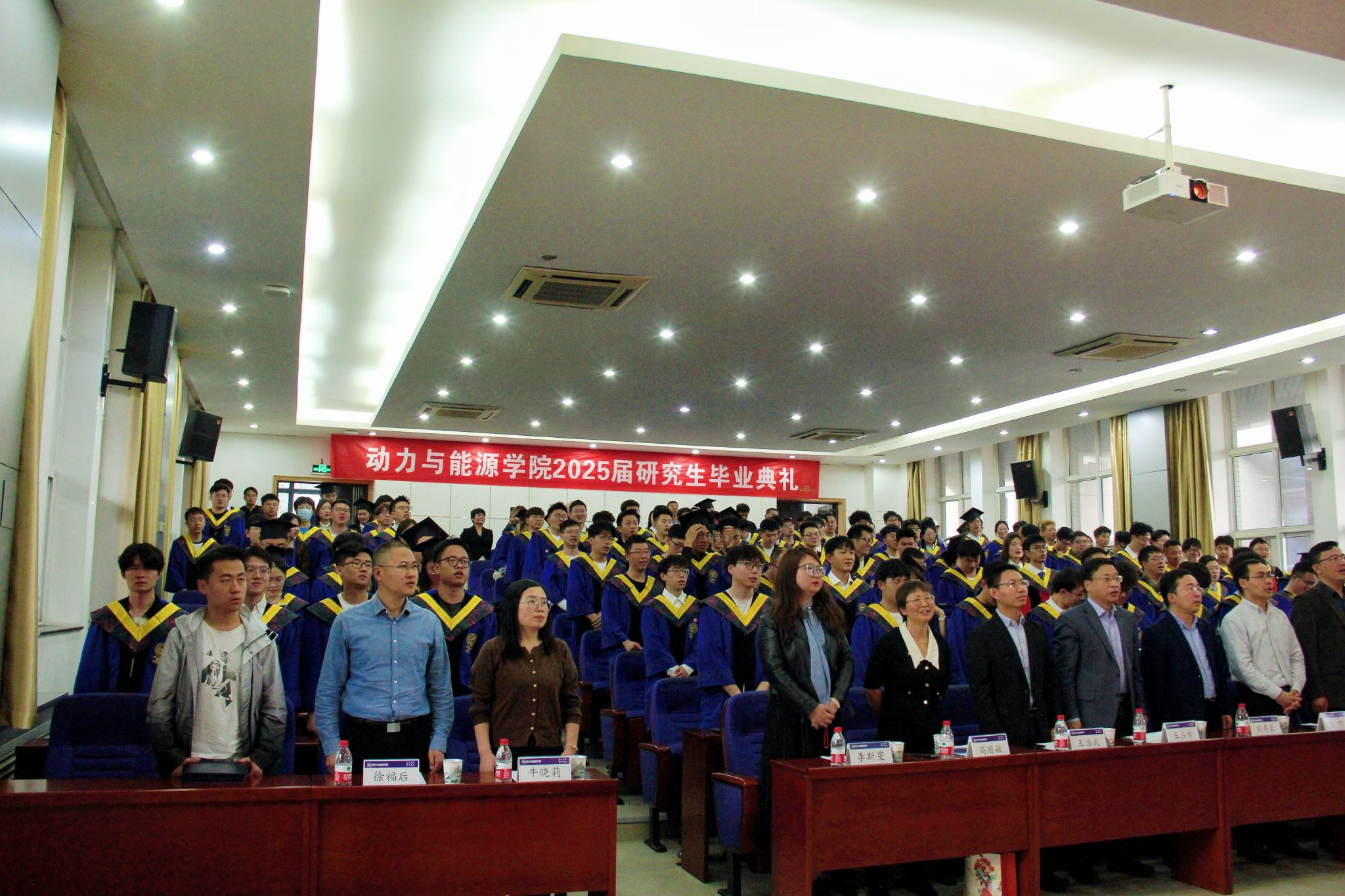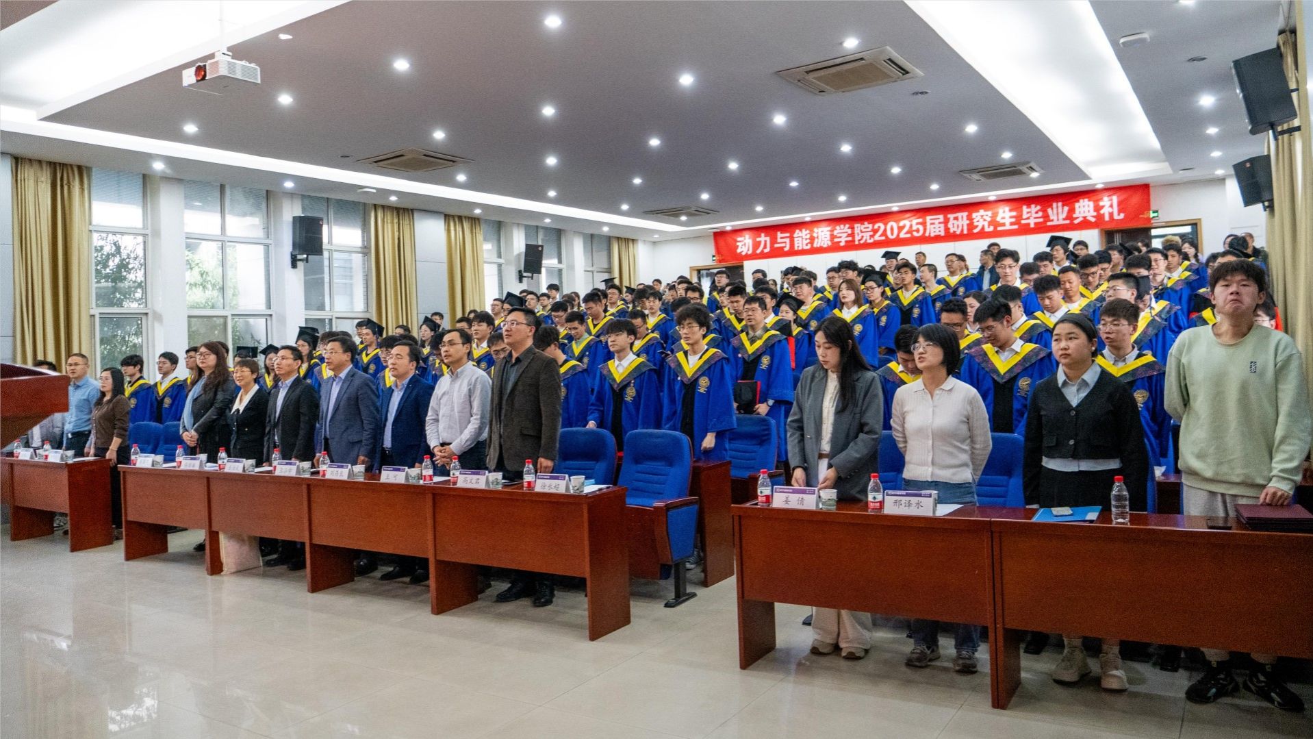 典礼在庄严的国歌声中拉开帷幕,毕业生们身着学位服肃然站立,齐唱国歌。