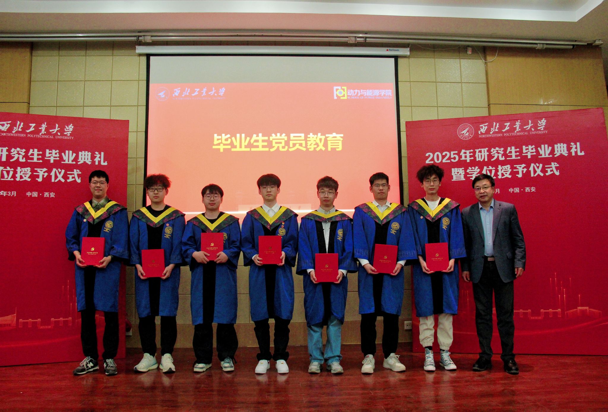 王占学为毕业生党员开展教育活动并颁发纪念品。他提出三点希望与即将走向社会的毕业生们共勉:一是多利他,少利己。多做利他的事,少做利己的事,要有博大的胸怀,切实为单位发展做出自己的贡献。二是多担当,少抱怨。脚踏实地,献身国防行业,发扬学校“三实一新”的校风,写好自己的西工大故事。三是多读书,少浮夸。在信息爆炸的时代,静下心来读书,丰富自己的精神世界。