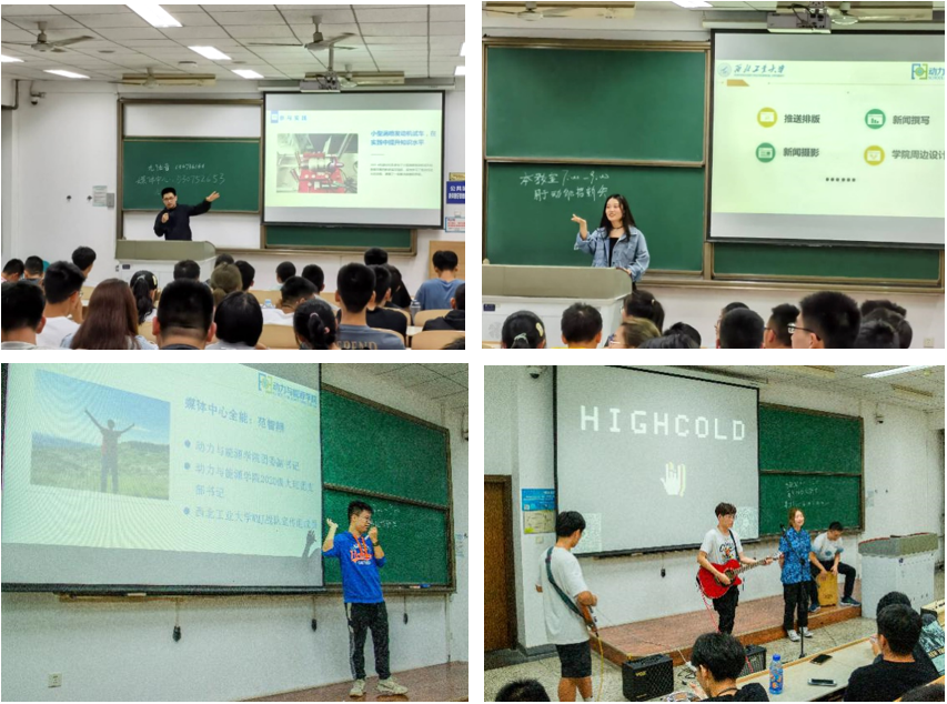 迎新工作结束后,为了使同学们尽快熟悉学院特色,了解学校的社团和课余生活,动能学院学生会还在9月4日晚,为同学们特地组织了一场社团招新宣讲会。通过自主报名和学生会筛选,最终共有包括大学生艺术团、模拟联合国基地等12个学生组织参加此次活动。不少社团和基地为同学们精心准备了表演或小礼物,同学们听得兴趣盎然,现场气氛热烈。