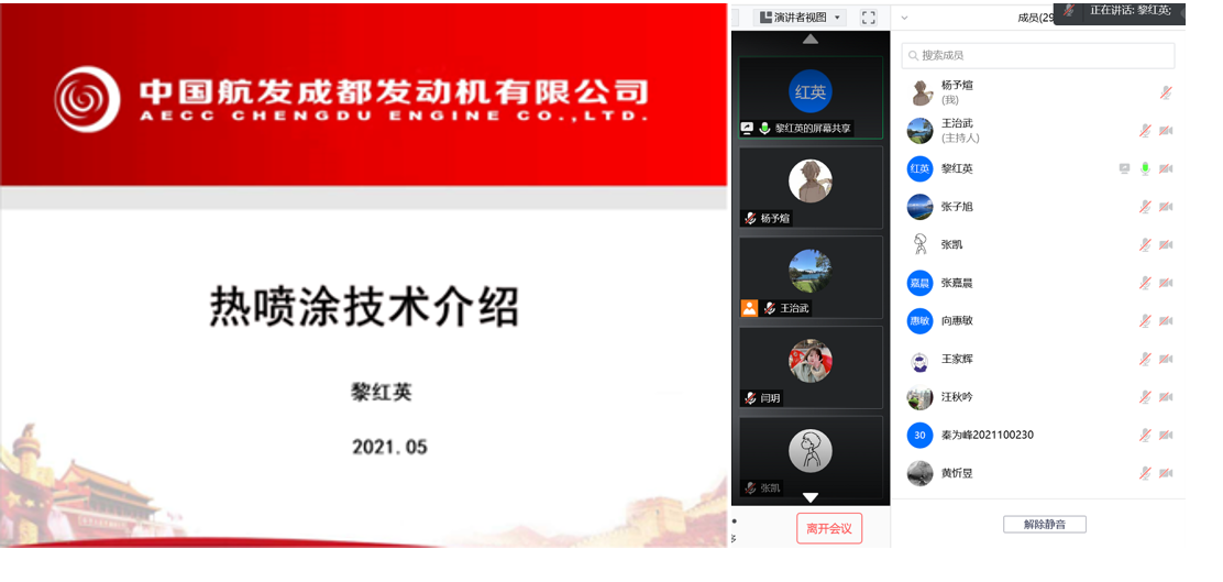2021年5月23日,由中国航发成发一级技术专家黎红英老师主讲的“热喷涂技术介绍”专题讲座在线上举行。威廉williamhill体育王治武教授,以及三十余名研究生参加了本次讲座,讲座由王治武主持。
