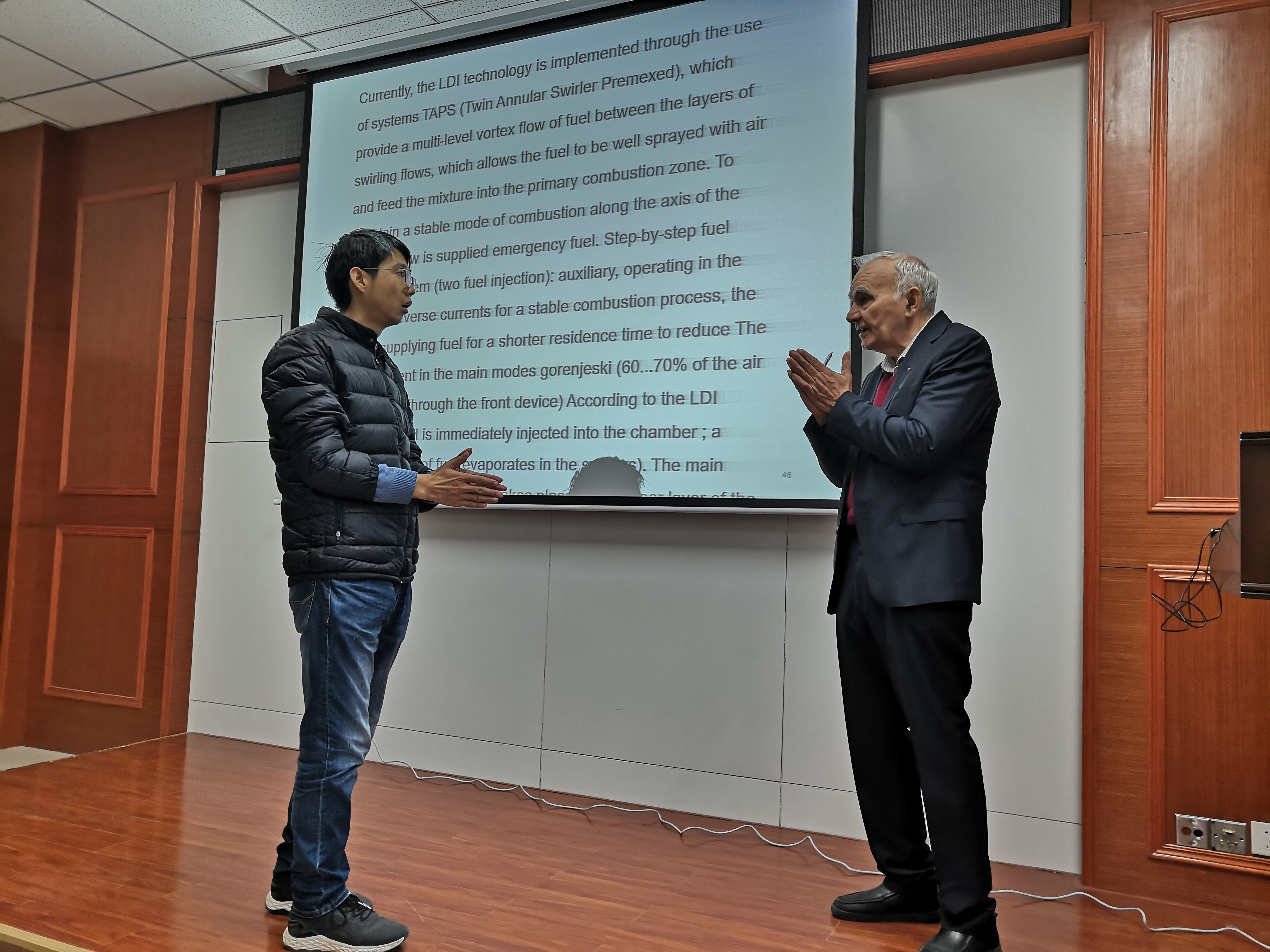 会议开始,宋文艳教授对Mingazov Bilal教授的到访表示了热烈的欢迎,并向参会的老师和学生介绍了Mingazov Bilal教授的主要研究方向和学术成就。上午的报告主题为“燃烧室中的物理过程”,报告中Mingazov Bilal教授首先介绍了燃烧领域的一些基本概况及基础知识,之后又从化学动力学和自燃的基本原理、燃烧室的特性、燃烧室设计的基本方法等方面系统阐述了他本人及其研究团队在燃烧研究领域的最新进展和成果。