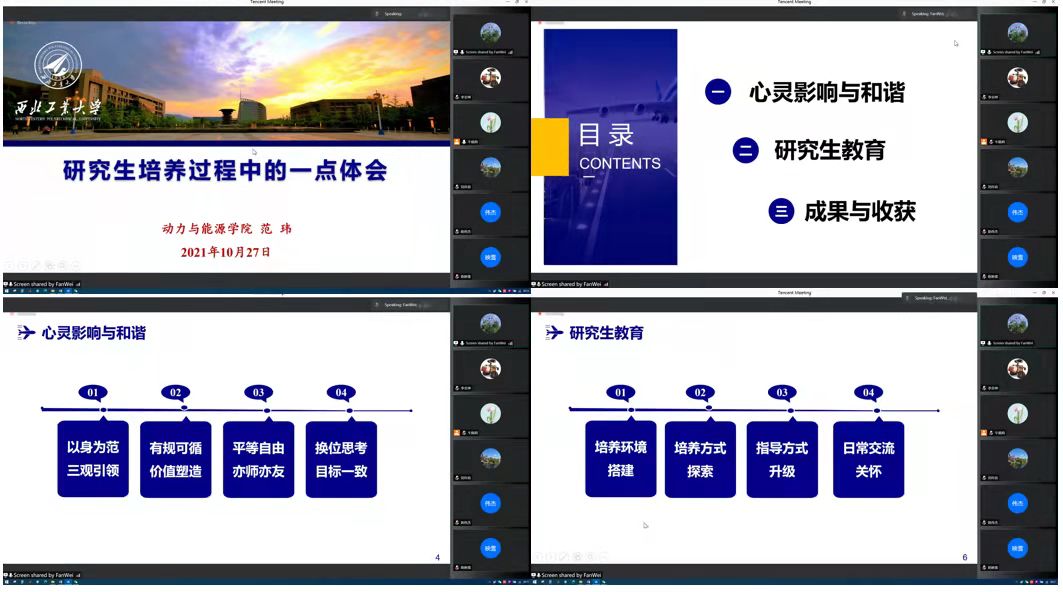 随后,范玮教授围绕心灵影响与和谐、研究生教育、成果与收获等三个方面分享了自己在研究生培养过程中的一些体会。她谈到,把研究生当作自己的孩子,因材施教,知人善任,鼓励和鞭策兼用,全方位地关心他们的身心健康,以满腔热情引导、助力他们的成长,激发出最大潜能,培养积极向上、执着坚韧、乐观自信、追求卓越的人生态度,为将来的精彩人生打下坚实基础。