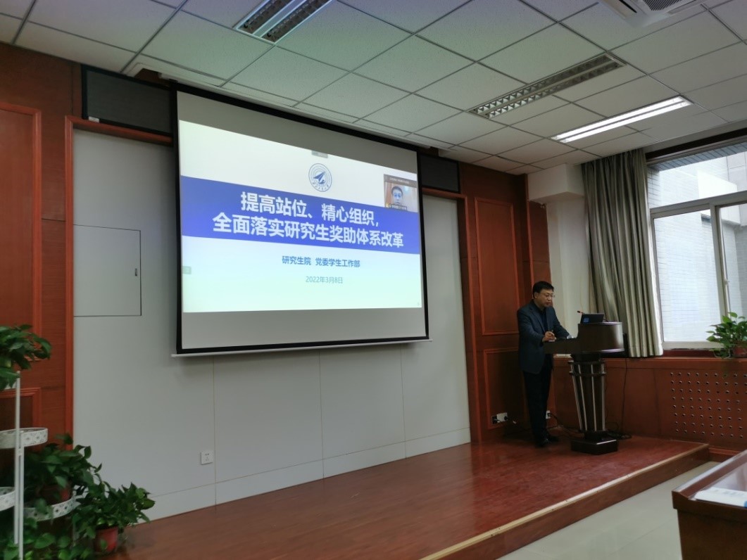 宣讲会上,王占学院长从改革背景、方案内容、问题分析及建议、工作要求四个方面对奖助学金政策文件进行了详细解读和说明。介绍了学校为构建多元化的奖助体系所做的具体工作,为研究生提供坚实的物质基础和强有力的政策保障。