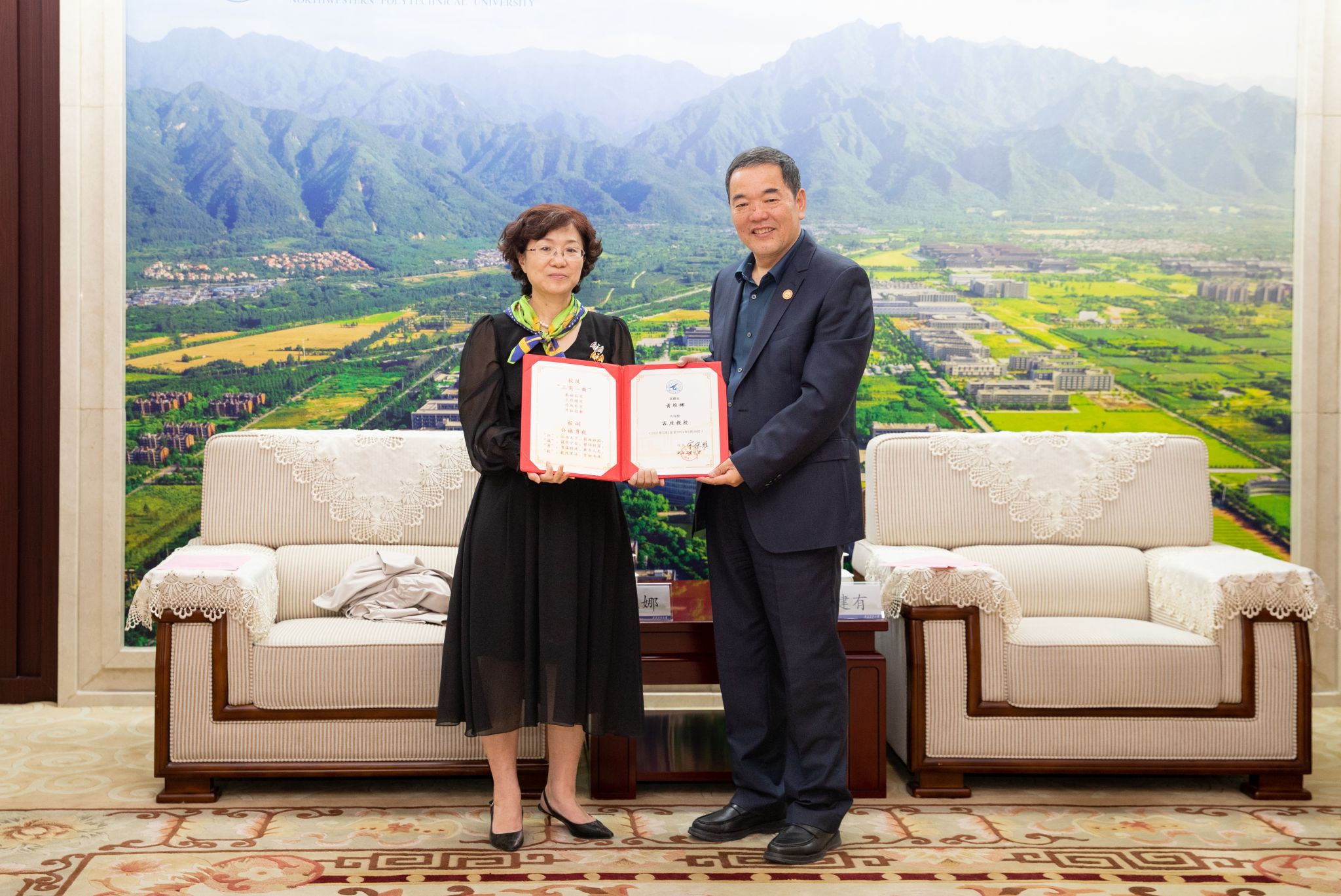 仪式上,王占学首先对黄维娜总师回归母校表示热烈欢迎和感谢,并对黄维娜总师的个人成就和学术情况进行介绍。随后,陈建有为黄维娜总师颁发聘书并佩戴校徽。